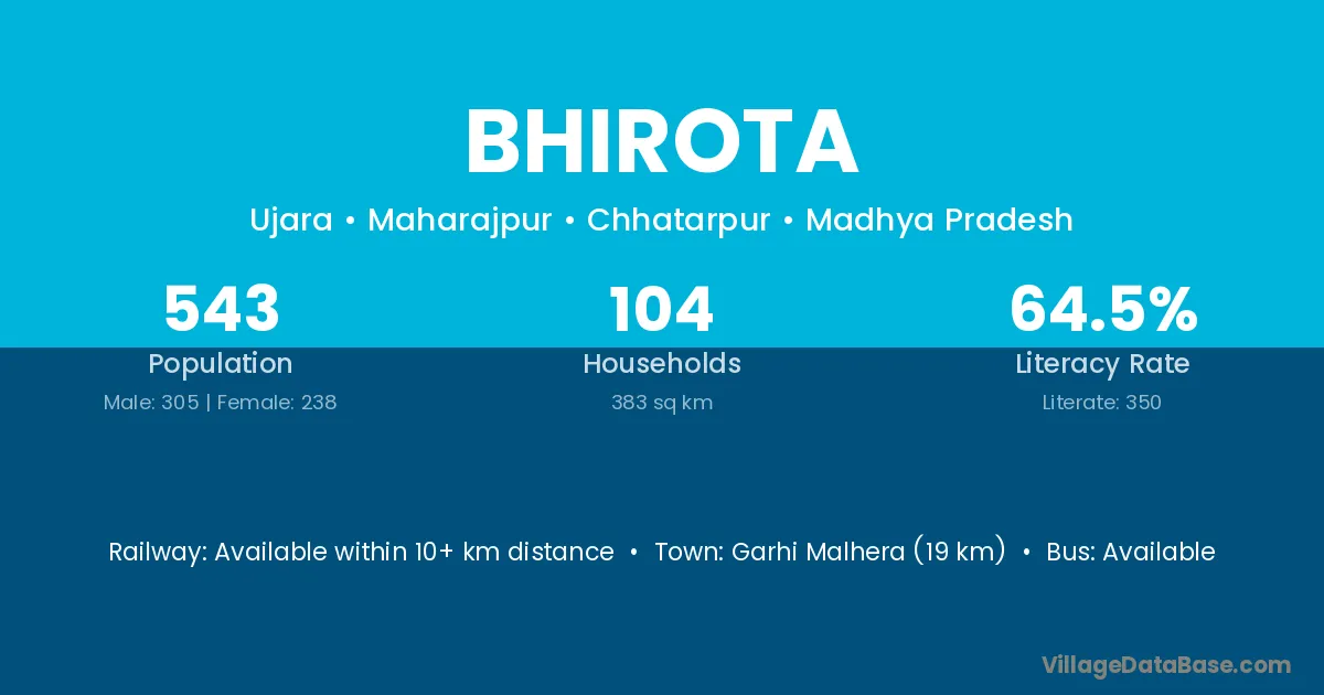 Garhi Malhera (19 km) is the nearest town to Bhirota village for major economic activities and is located approximately 19 km away.