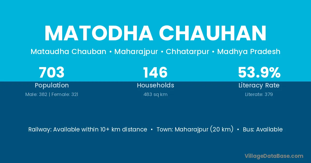 Maharajpur (20 km) is the nearest town to Matodha Chauhan village for major economic activities and is located approximately 20 km away.