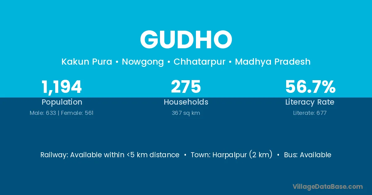 Harpalpur (2 km) is the nearest town to Gudho village for major economic activities and is located approximately 2 km away.