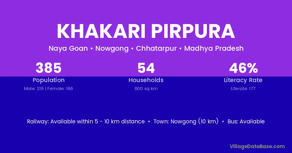Khakari Pirpura village has a total population of 385 people, of which 219 are males and 166 are females.