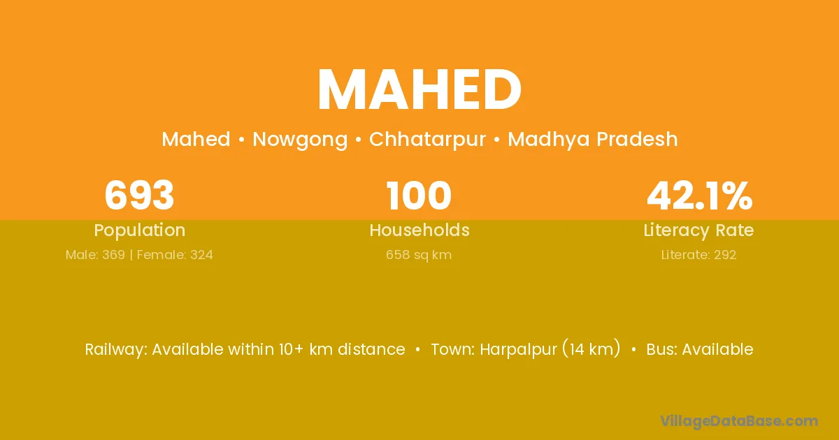 Harpalpur (14 km) is the nearest town to Mahed village for major economic activities and is located approximately 14 km away.