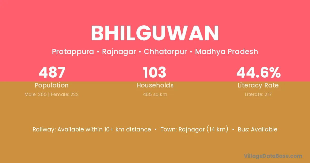 Rajnagar (14 km) is the nearest town to Bhilguwan village for major economic activities and is located approximately 14 km away.