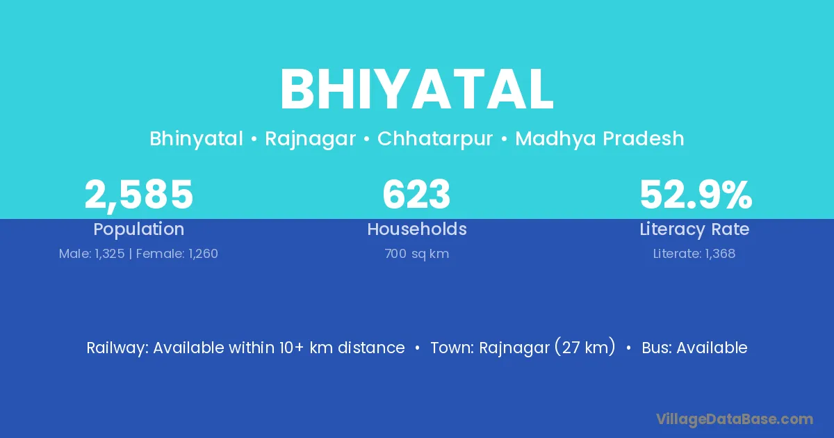 Bhiyatal village has a total population of 2,585 people, of which 1,325 are males and 1,260 are females.