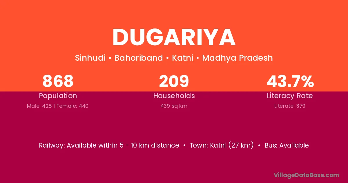 Rajnagar (38 km) is the nearest town to Dugariya village for major economic activities and is located approximately 38 km away.