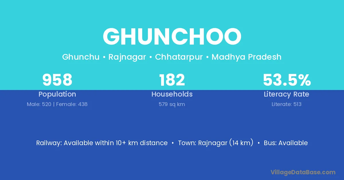 Rajnagar (14 km) is the nearest town to Ghunchoo village for major economic activities and is located approximately 14 km away.