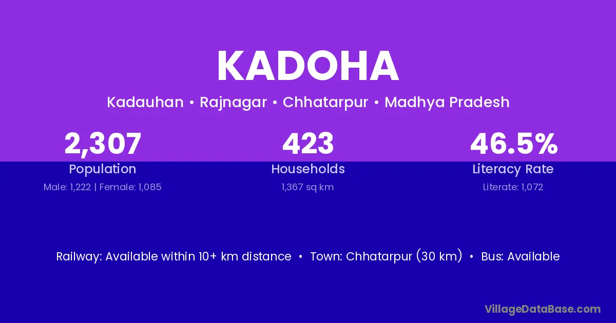 Chhatarpur (30 km) is the nearest town to Kadoha village for major economic activities and is located approximately 30 km away.