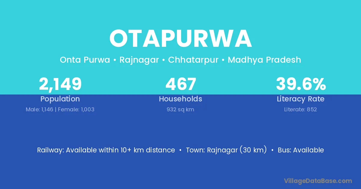 Otapurwa village has a total population of 2,149 people, of which 1,146 are males and 1,003 are females.