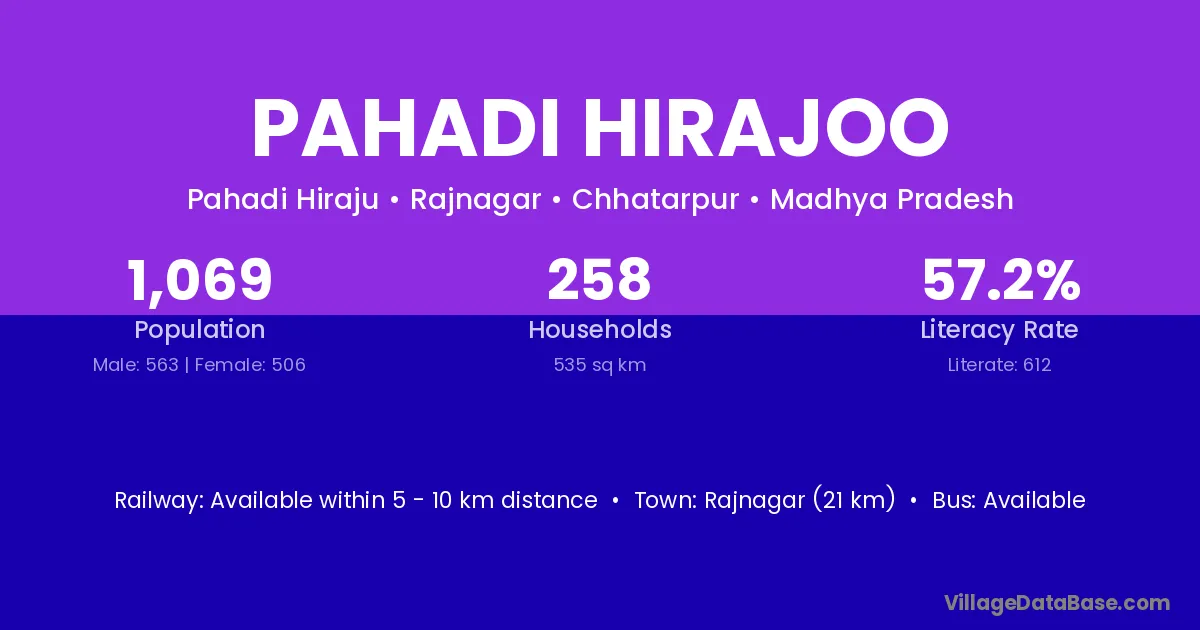 Rajnagar (21 km) is the nearest town to Pahadi Hirajoo village for major economic activities and is located approximately 21 km away.
