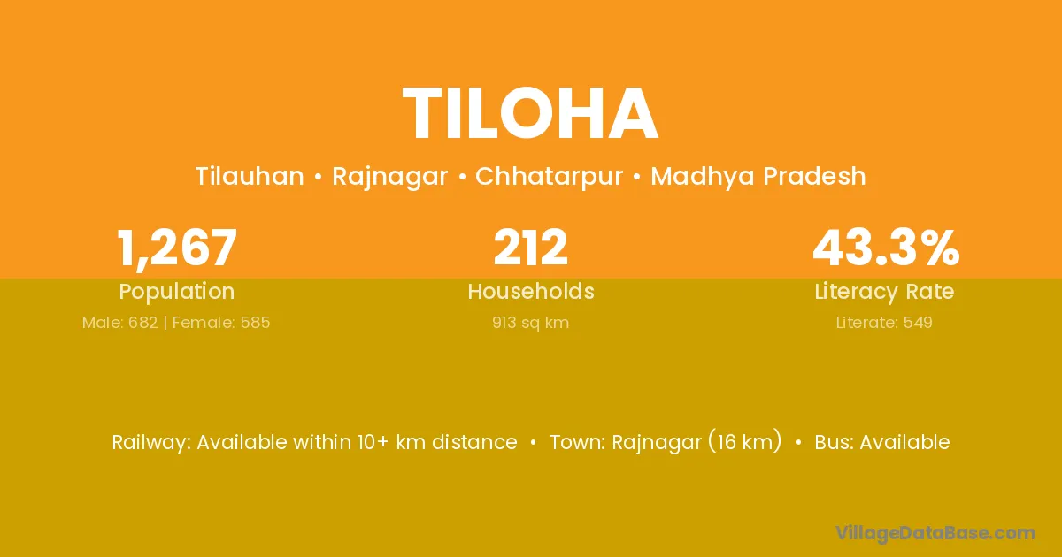 Rajnagar (16 km) is the nearest town to Tiloha village for major economic activities and is located approximately 16 km away.