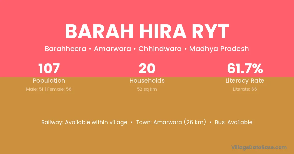 Amarwara (26 km) is the nearest town to Barah Hira Ryt village for major economic activities and is located approximately 26 km away.