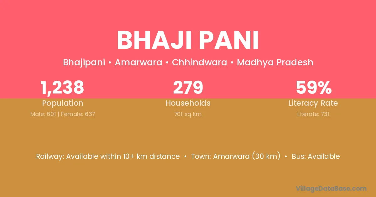 Amarwara (30 km) is the nearest town to Bhaji Pani village for major economic activities and is located approximately 30 km away.