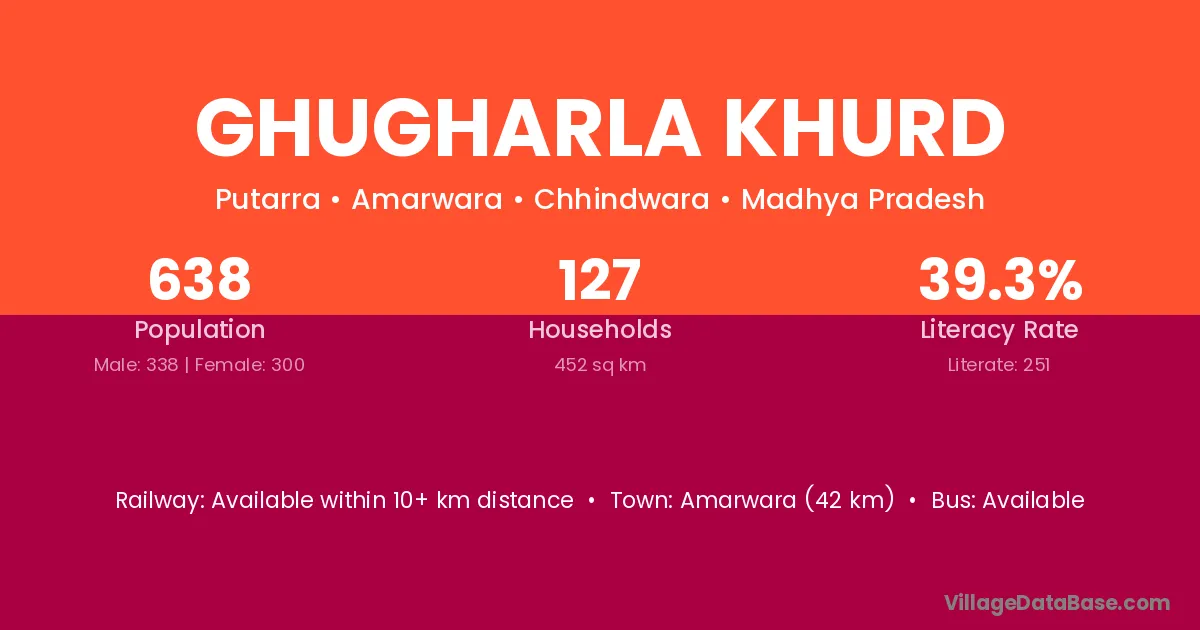 Amarwara (42 km) is the nearest town to Ghugharla Khurd village for major economic activities and is located approximately 42 km away.