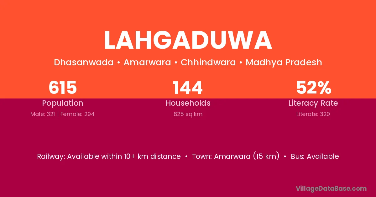 Amarwara (15 km) is the nearest town to Lahgaduwa village for major economic activities and is located approximately 15 km away.
