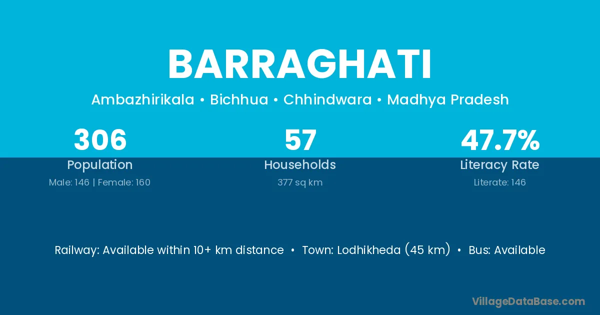 Lodhikheda (45 km) is the nearest town to Barraghati village for major economic activities and is located approximately 45 km away.