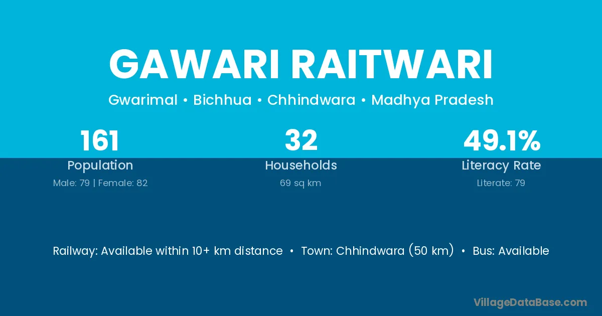 Chhindwara (50 km) is the nearest town to Gawari Raitwari village for major economic activities and is located approximately 50 km away.