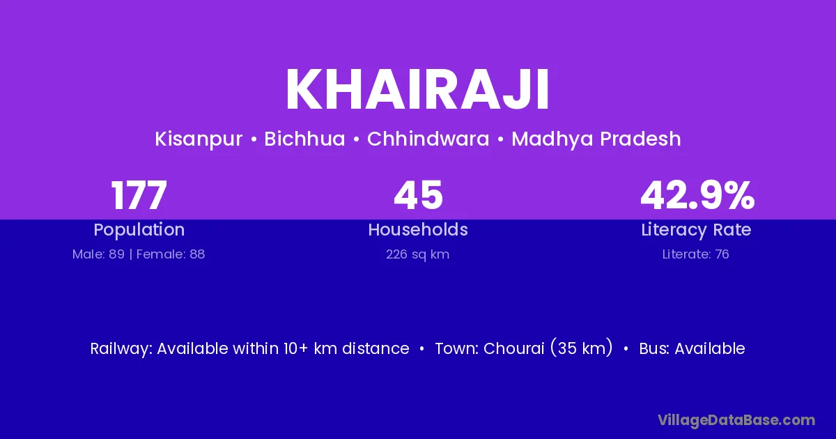 Khairaji village has a total population of 177 people, of which 89 are males and 88 are females.