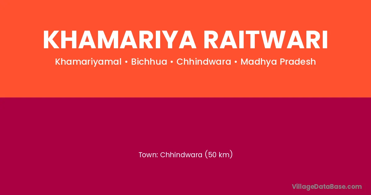 Chhindwara (50 km) is the nearest town to Khamariya Raitwari village for major economic activities and is located approximately 50 km away.