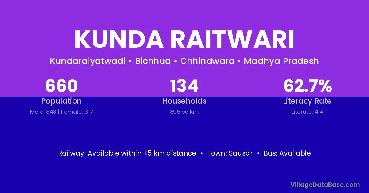 Kunda Raitwari village has a total population of 660 people, of which 343 are males and 317 are females.