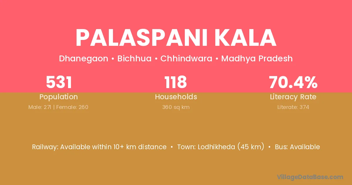 Lodhikheda (45 km) is the nearest town to Palaspani Kala village for major economic activities and is located approximately 45 km away.