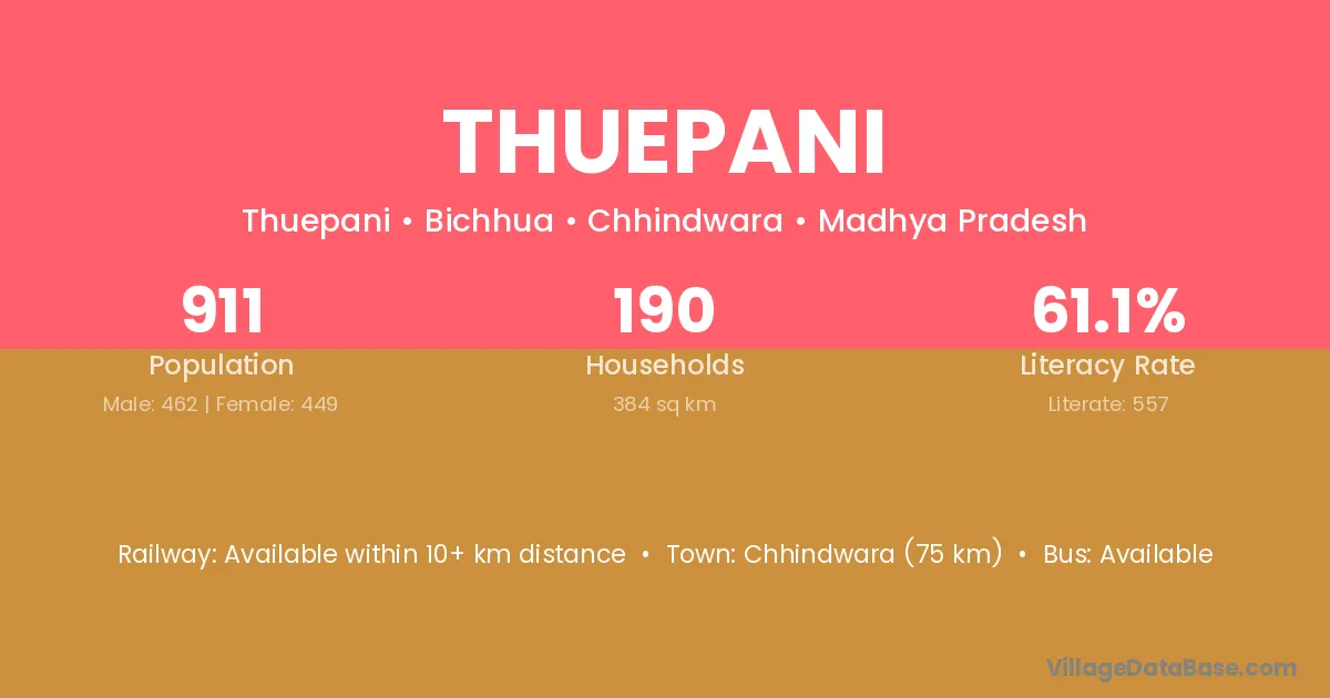 Chhindwara (75 km) is the nearest town to Thuepani village for major economic activities and is located approximately 75 km away.