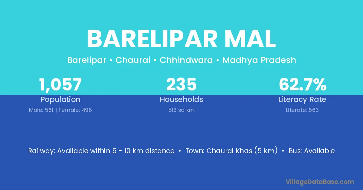 Chaurai Khas (5 km) is the nearest town to Barelipar Mal village for major economic activities and is located approximately 5 km away.