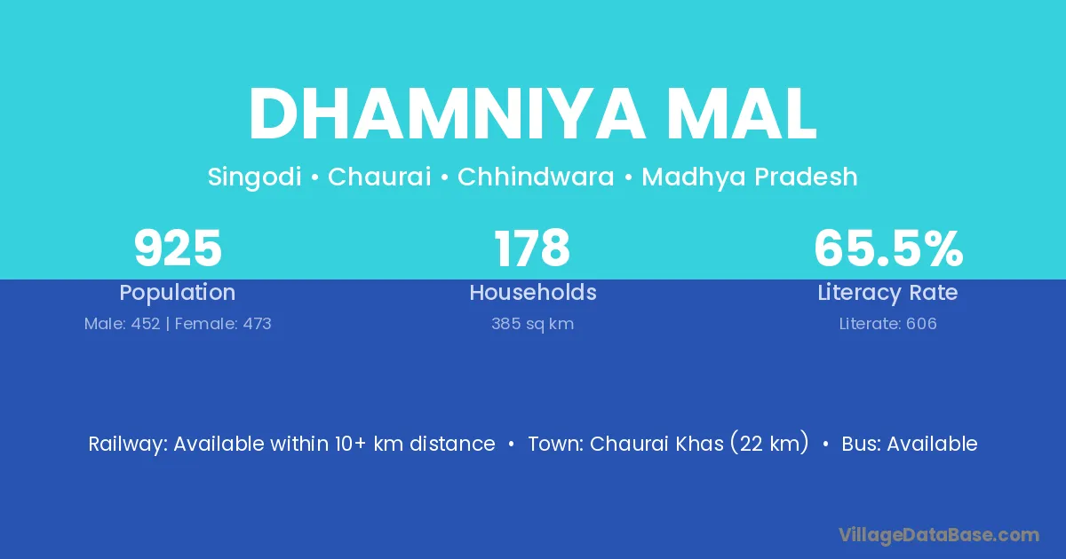Dhamniya Mal village has a total population of 925 people, of which 452 are males and 473 are females.