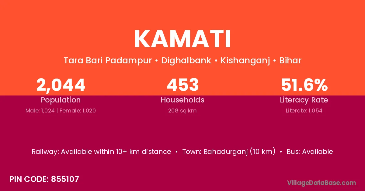 The literacy rate of Kamati village is 54.98%. Male literacy stands at 64.50% and female literacy at 43.66%.