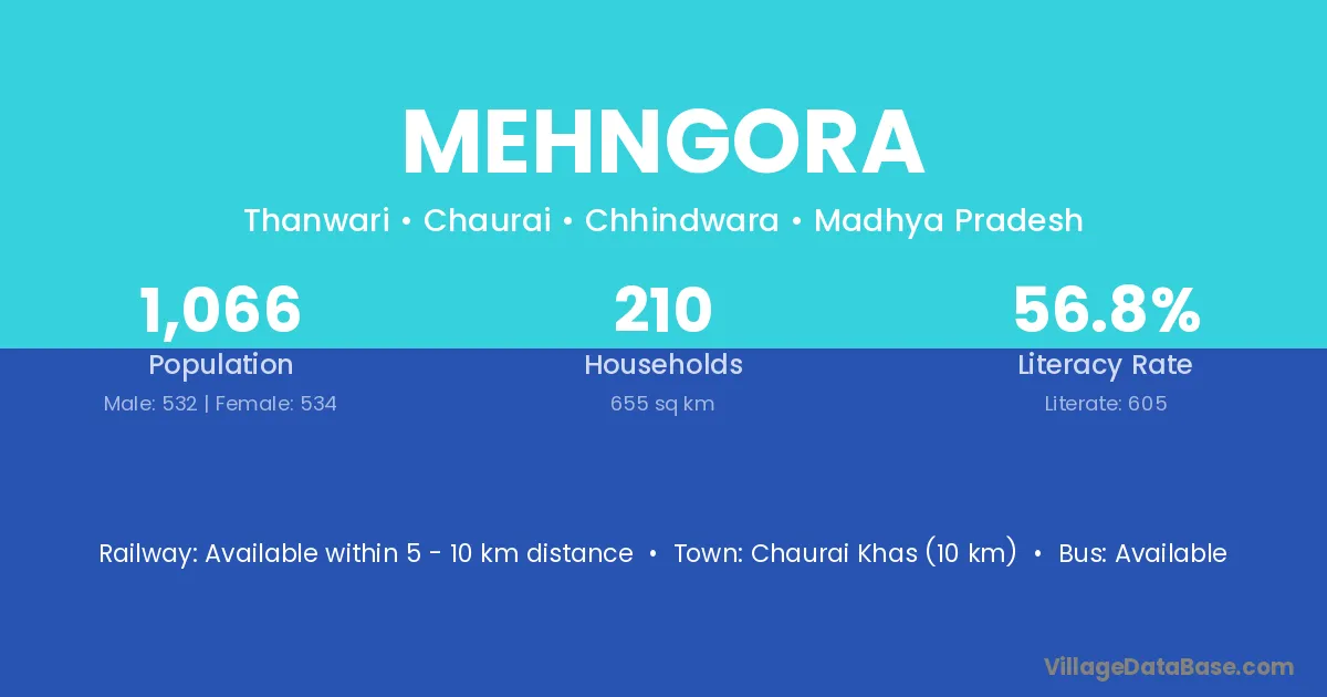 Chaurai Khas (10 km) is the nearest town to Mehngora village for major economic activities and is located approximately 10 km away.