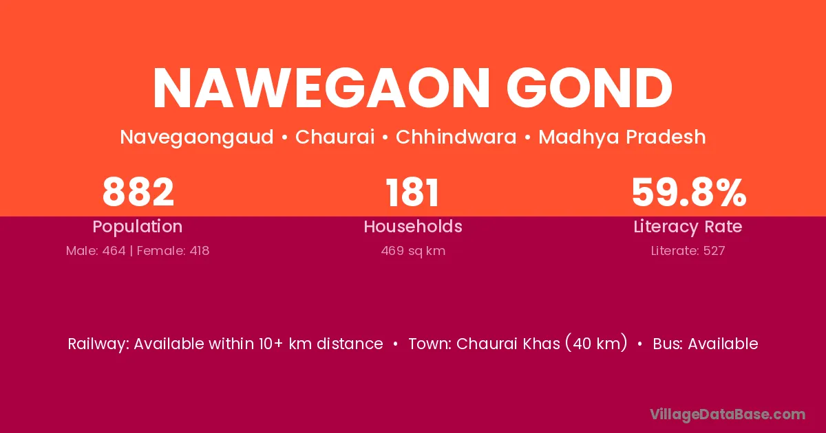 Chaurai Khas (40 km) is the nearest town to Nawegaon Gond village for major economic activities and is located approximately 40 km away.