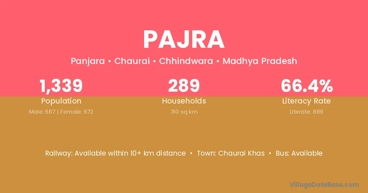 Pajra village has a total population of 1,339 people, of which 667 are males and 672 are females.