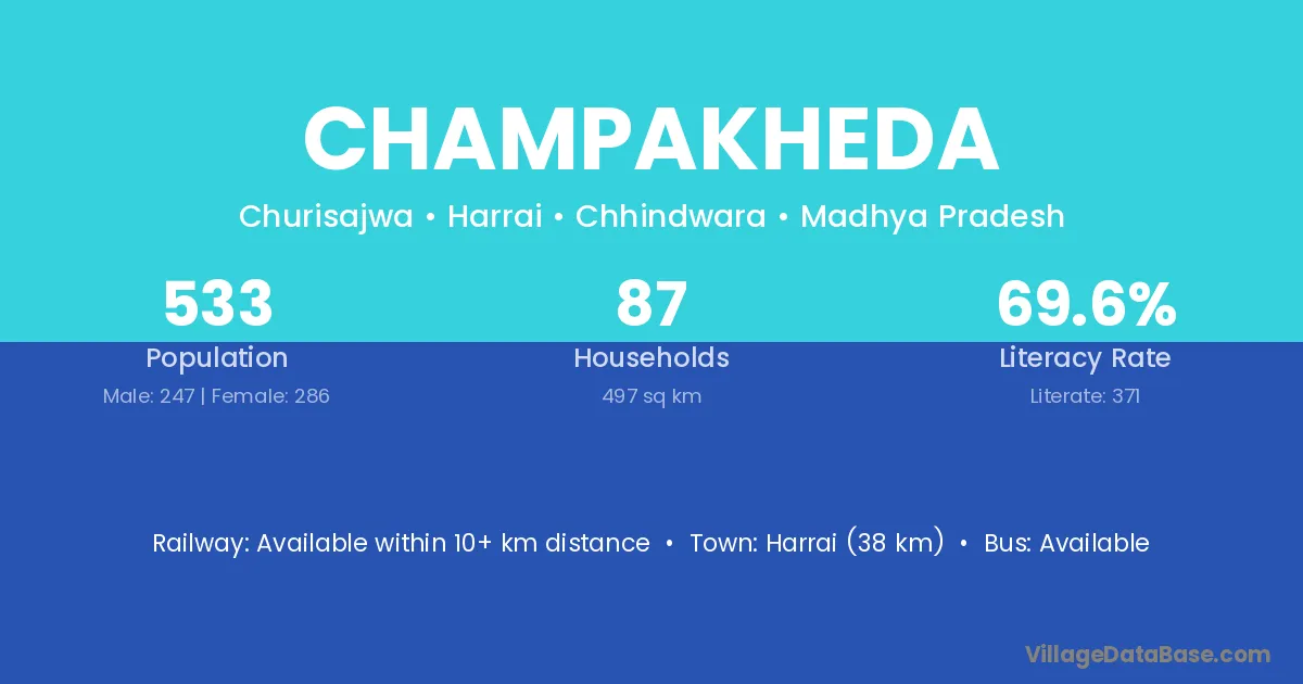 Harrai (38 km) is the nearest town to Champakheda village for major economic activities and is located approximately 38 km away.