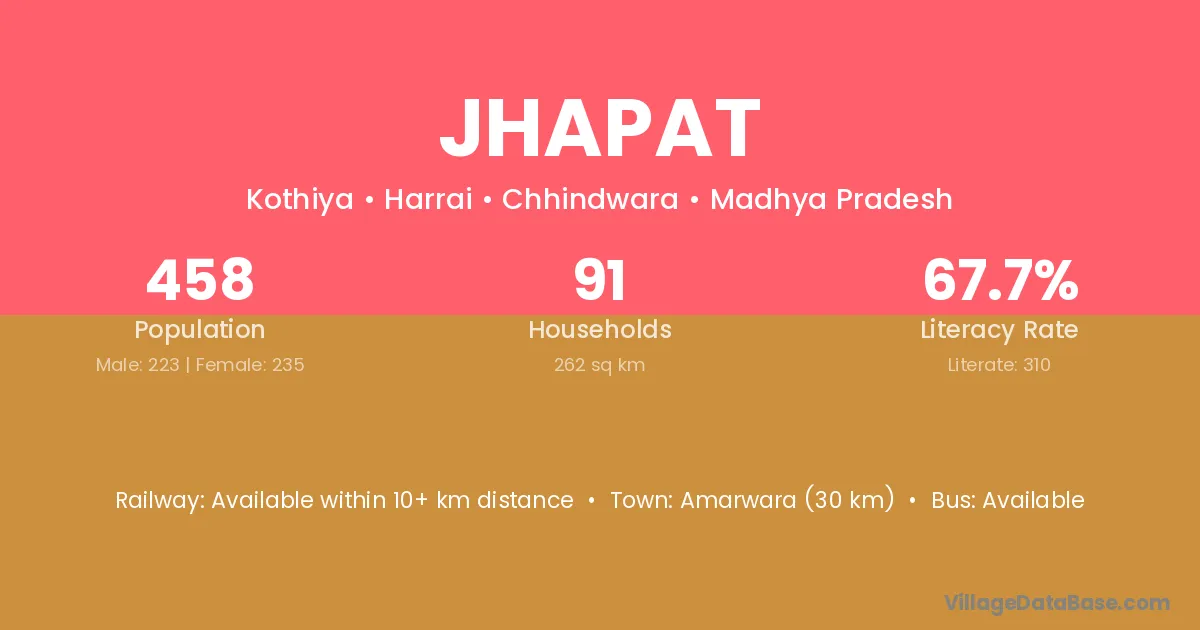 Jhapat village has a total population of 458 people, of which 223 are males and 235 are females.