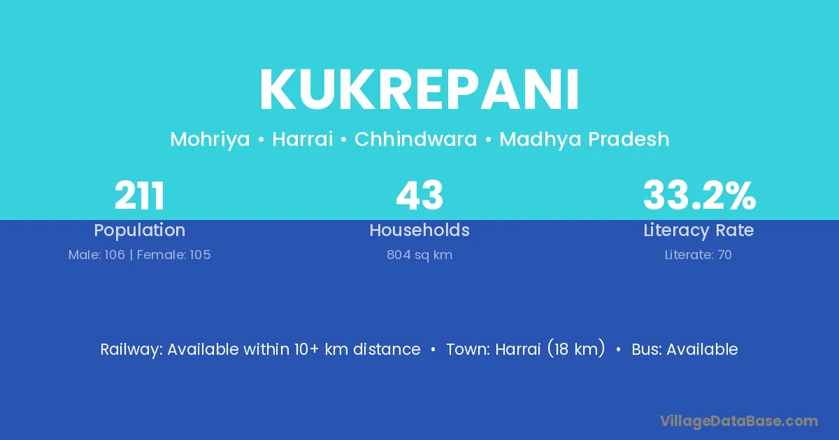 Kukrepani village has a total population of 211 people, of which 106 are males and 105 are females.