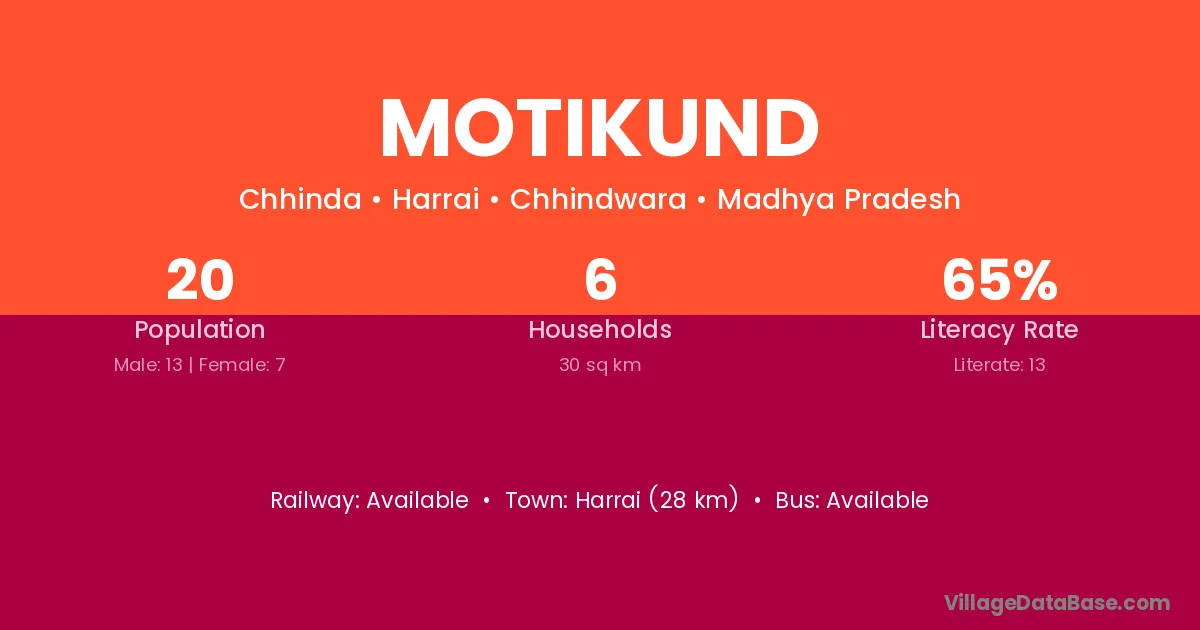 Motikund village has a total population of 20 people, of which 13 are males and 7 are females.