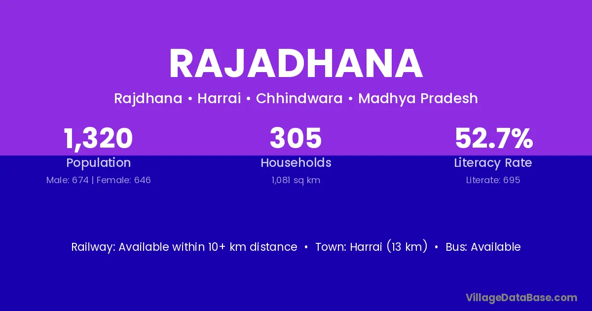 Rajadhana village has a total population of 1,320 people, of which 674 are males and 646 are females.