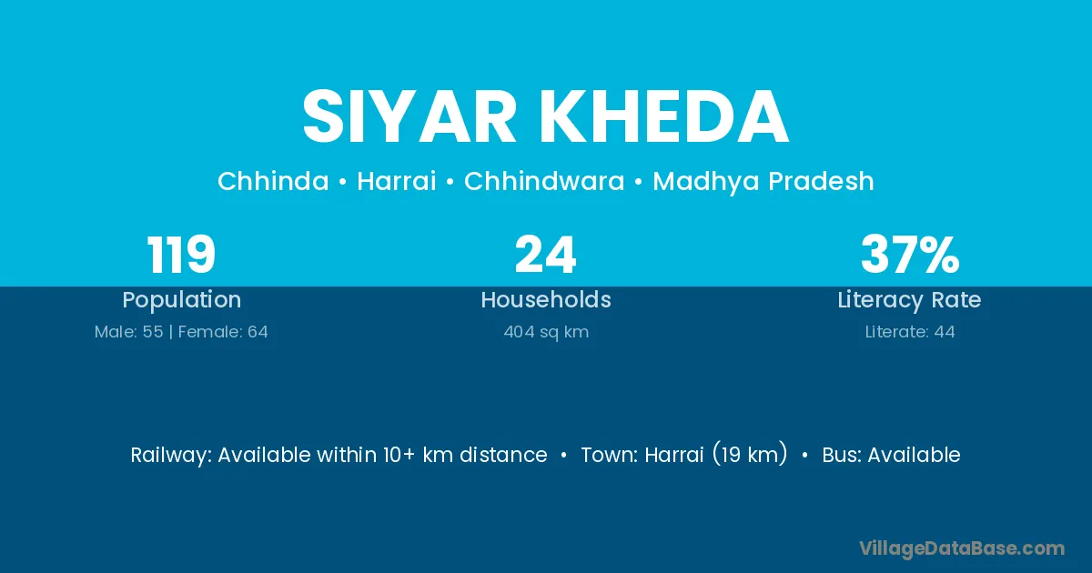 Harrai (19 km) is the nearest town to Siyar Kheda village for major economic activities and is located approximately 19 km away.
