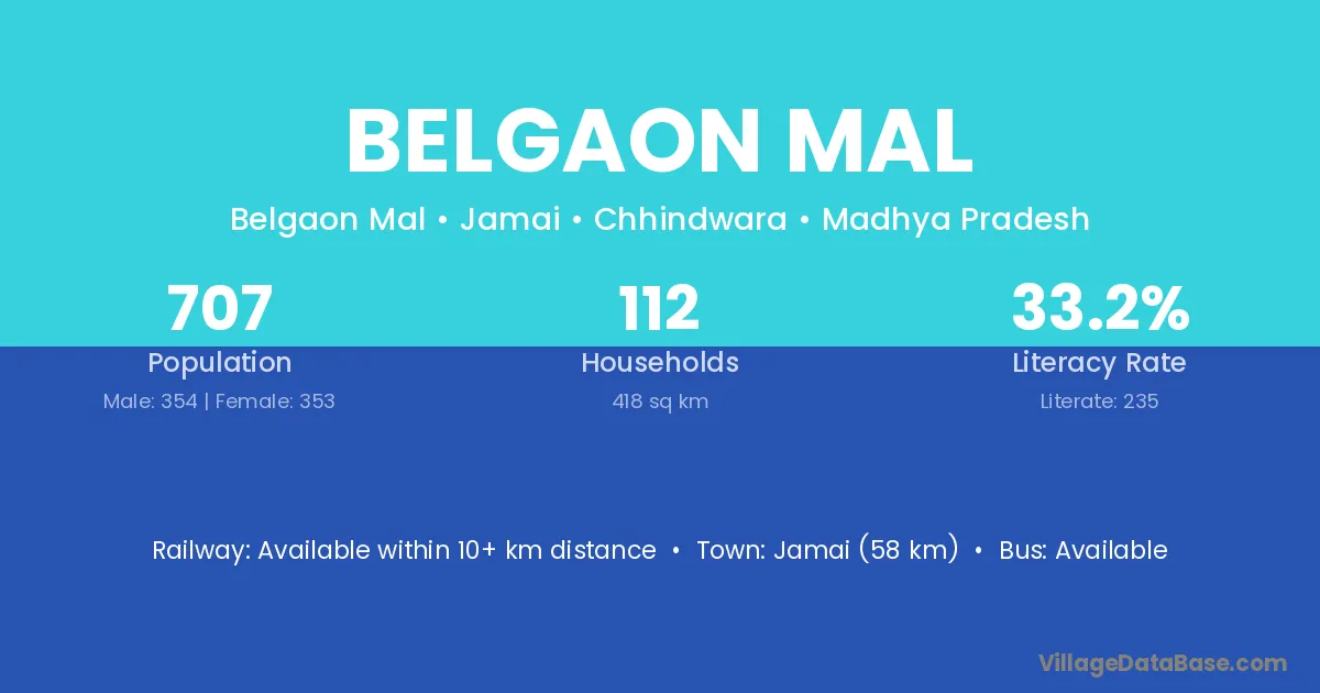 Belgaon Mal village has a total population of 707 people, of which 354 are males and 353 are females.