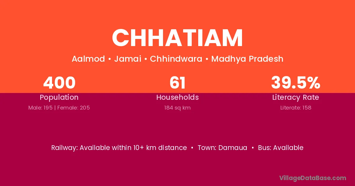 Chhatiam village has a total population of 400 people, of which 195 are males and 205 are females.