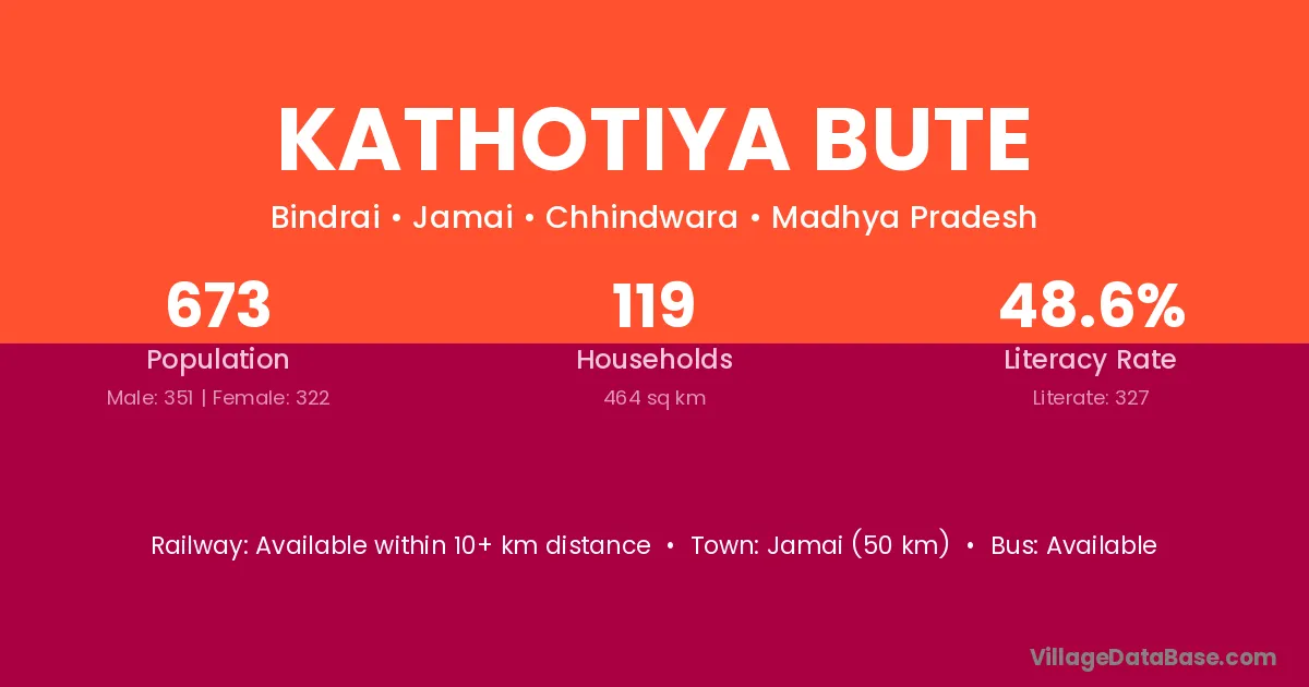 Jamai (50 km) is the nearest town to Kathotiya Bute village for major economic activities and is located approximately 50 km away.