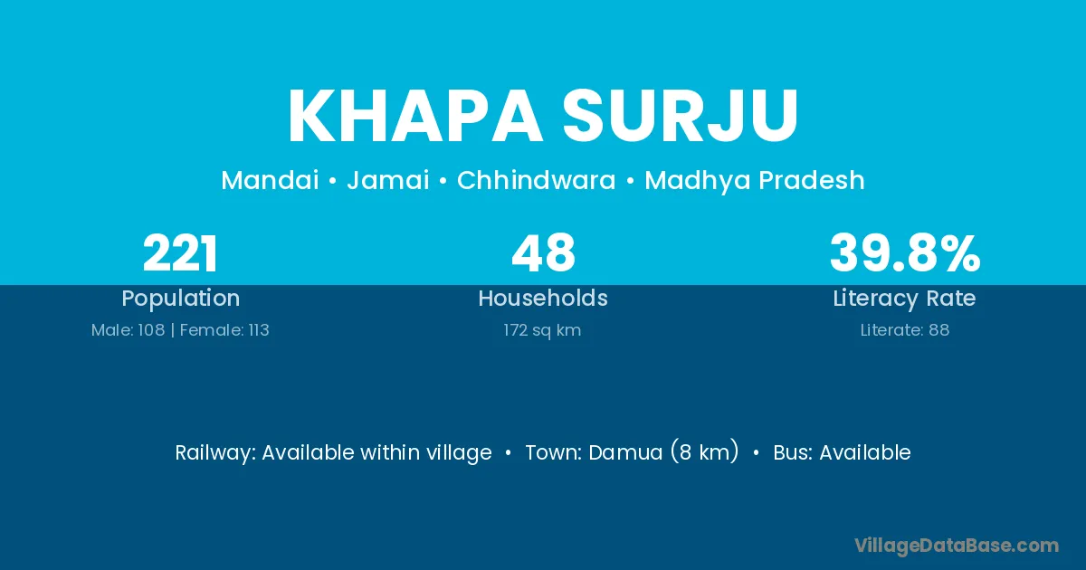Khapa Surju village has a total population of 221 people, of which 108 are males and 113 are females.