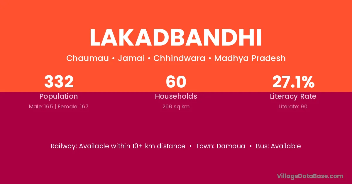Lakadbandhi village has a total population of 332 people, of which 165 are males and 167 are females.