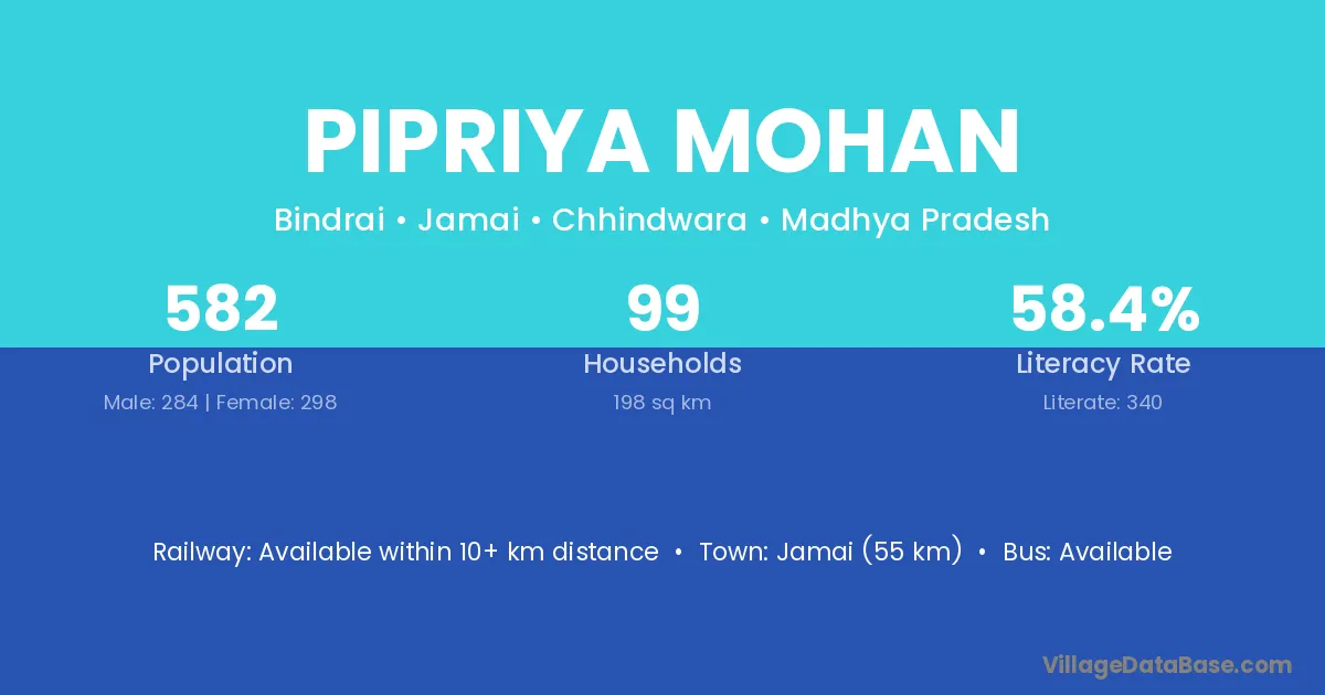 Jamai (55 km) is the nearest town to Pipriya Mohan village for major economic activities and is located approximately 55 km away.