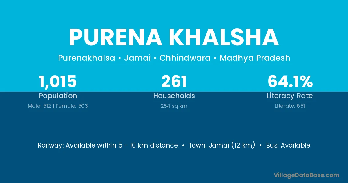 Purena Khalsha village has a total population of 1,015 people, of which 512 are males and 503 are females.