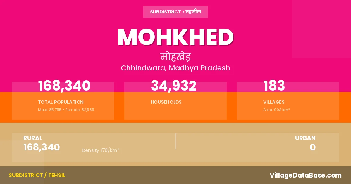 According to the 2011 census The total area of Mohkhed Tehsil is 993 km², with a population of 168340 people. The population density is 170 inhabitants per square kilometre, and there are approximately 34932 houses in the sub district.