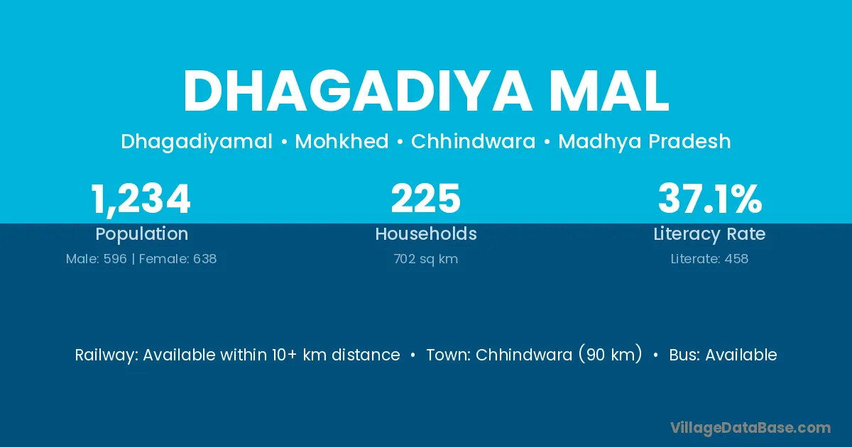 Chhindwara (90 km) is the nearest town to Dhagadiya Mal village for major economic activities and is located approximately 90 km away.