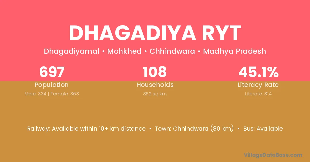 Chhindwara (80 km) is the nearest town to Dhagadiya Ryt village for major economic activities and is located approximately 80 km away.
