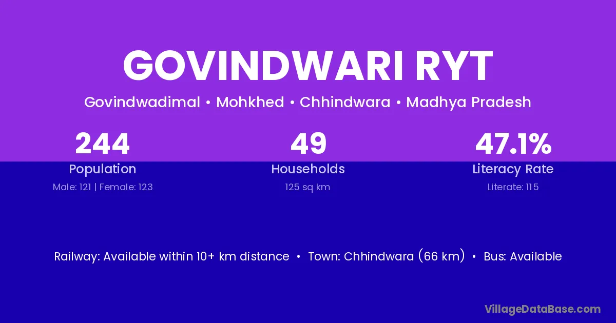 Chhindwara (66 km) is the nearest town to Govindwari Ryt village for major economic activities and is located approximately 66 km away.