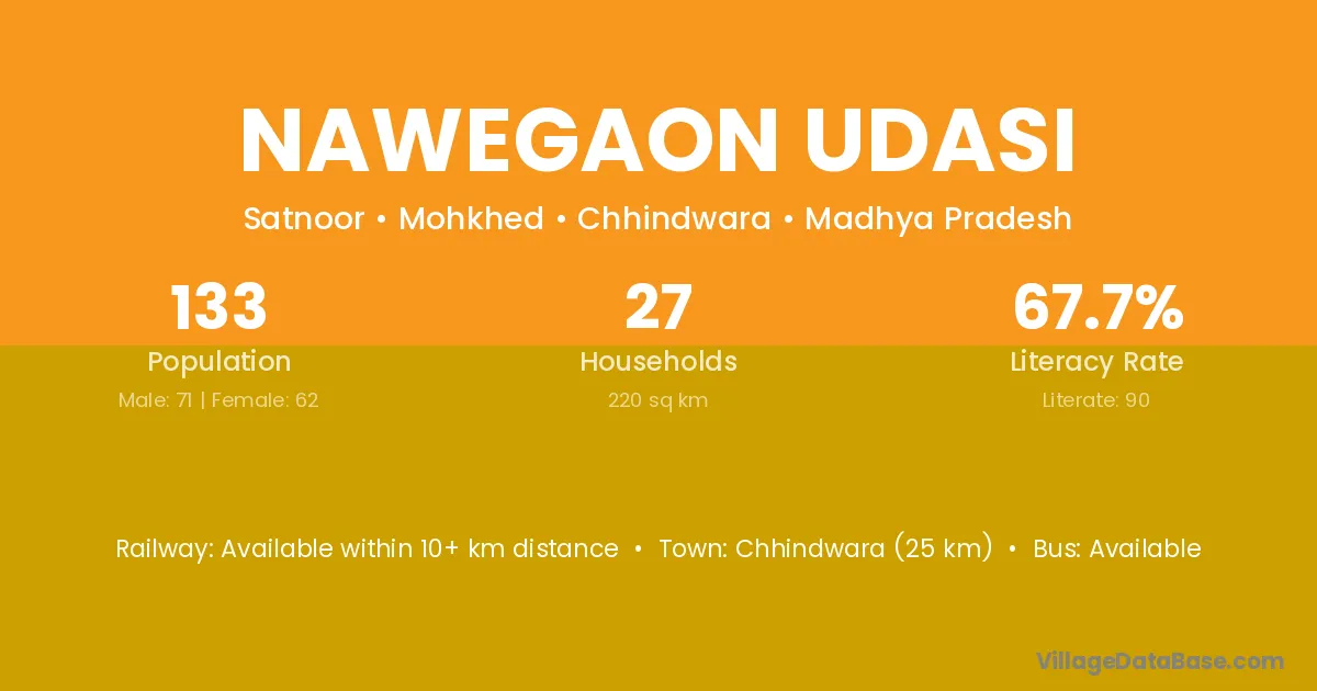 Chhindwara (25 km) is the nearest town to Nawegaon Udasi village for major economic activities and is located approximately 25 km away.