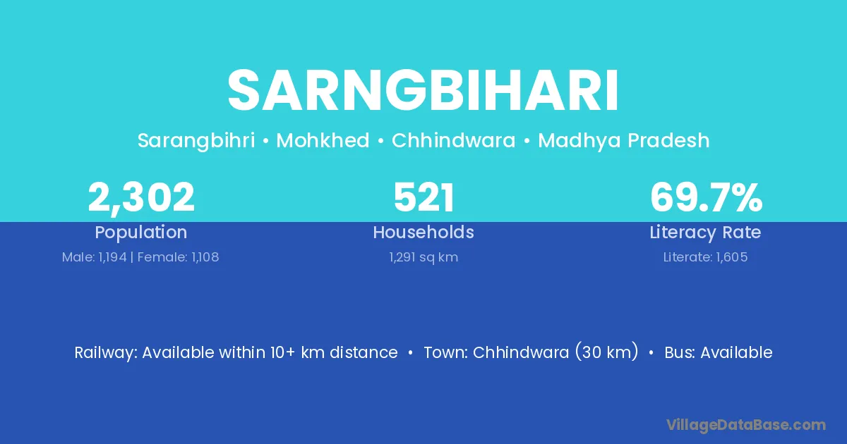 Chhindwara (30 km) is the nearest town to Sarngbihari village for major economic activities and is located approximately 30 km away.