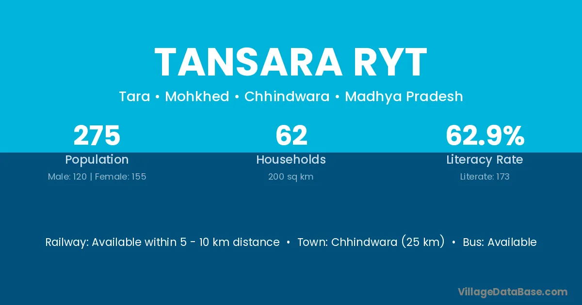 Chhindwara (25 km) is the nearest town to Tansara Ryt village for major economic activities and is located approximately 25 km away.